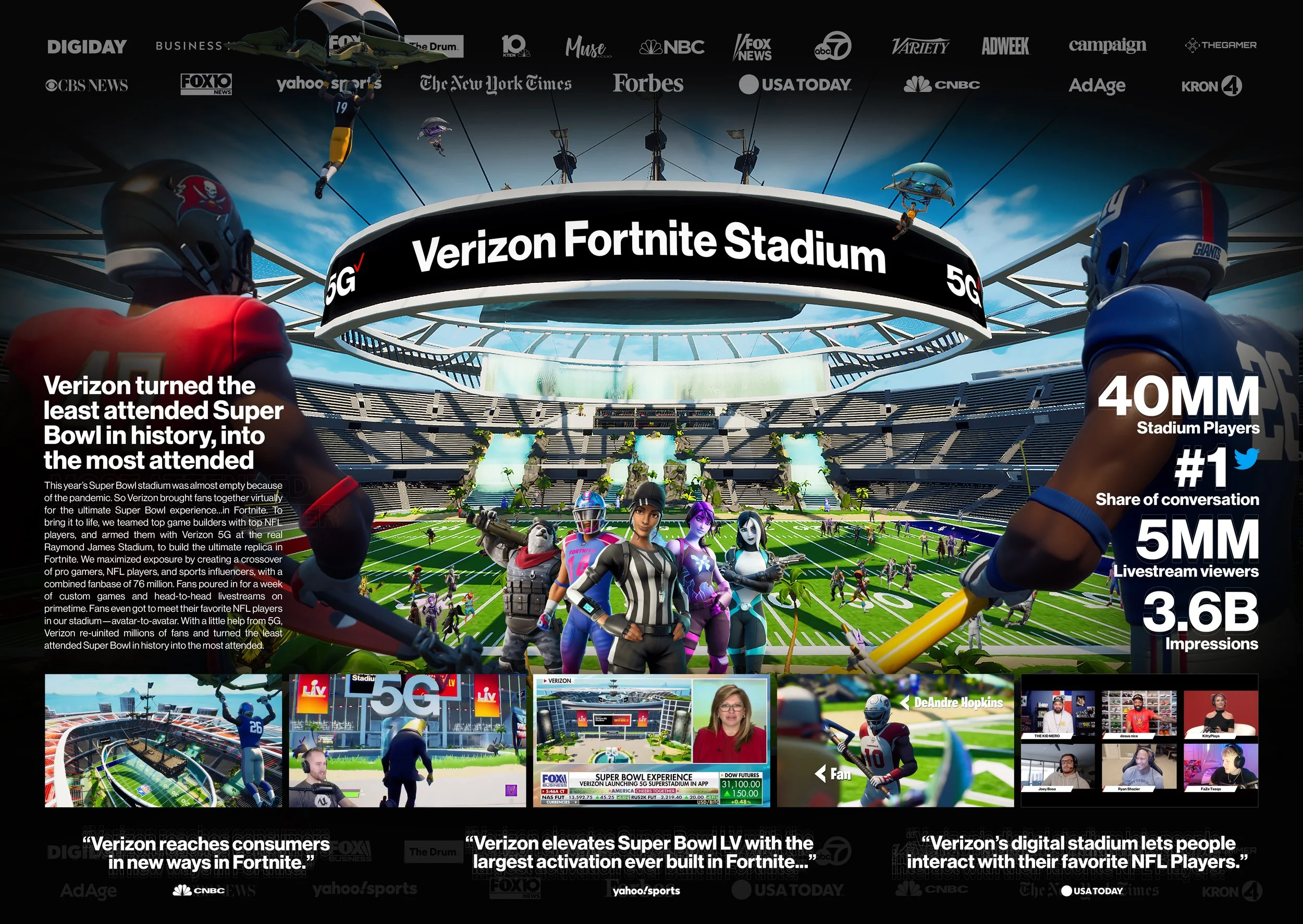 The first Super Bowl of the pandemic, only a few people could physically attend the Super Bowl. Verizon created a place where everyone could play, gather, and safely celebrate the Super Bowl together: a super-charged replica of Tampa’s Raymond James stadium in Fortnite, with custom mini games, NFL player metaverse meet-and-greets, and pro player vs pro gamer livestreams on Twitch.